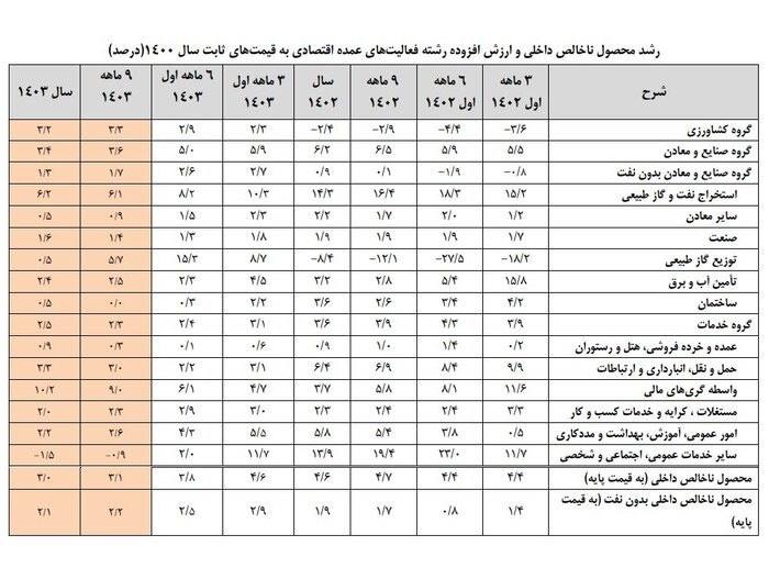 نتایج محاسبات حاکی از آن است که رشته فعالیت های گروه کشاورزی ۳.۲ درصد (شامل زیر بخش های زراعت و باغداری، دامداری، جنگل داری و ماهیگیری)، گروه صنایع و معادن ۳/۴ درصد (شامل: استخراج نفت و گاز طبیعی۶.۲، سایر معادن ۰.۵ ، صنعت ۱.۶ توزیع گاز طبیعی ۰.۵ تأمین آب و برق ۲.۴ و ساختمان ۰.۵ درصد) و فعالیتهای گروه خدمات ۲.۵ درصد (شامل زیر بخش های عمده وخرده فروشی ، فعالیت های خدماتی مربوط به تأمین جا و غذا، حمل ونقل، انبارداری ، پست، اطلاعات و ارتباطات، فعالیت های مالی و بیمه، مستغلات ، کرایه و خدمات کسب و کار و دامپزشکی، اداره امورعمومی و خدمات شهری، آموزش، فعالیت های مربوط به سلامت انسان و مددکاری اجتماعی و سایرخدمات عمومی ، اجتماعی، شخصی و خانگی) نسبت به سال ۱۴۰۲ رشد داشته است.