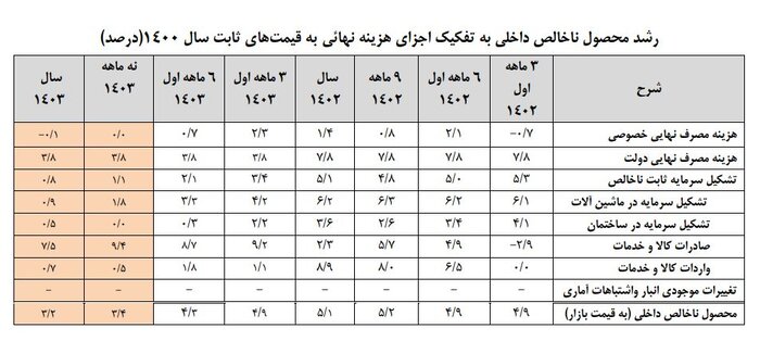 بررسی روند رشد اجزای تقاضای نهایی در سال ۱۴۰۳ نسبت به سال قبل نشان می دهد، هزینه مصرف نهایی خصوصی معادل ۰.۱ درصد کاهش، هزینه مصرف نهایی دولت ۳.۸ درصد افزایش، تشکیل سرمایه ثابت ناخالص ۰.۸ درصد افزایش، صادرات کالا و خدمات ۷.۵ درصد افزایش و واردات کالا و خدمات نیز ۰.۷ درصد، افزایش داشته است.